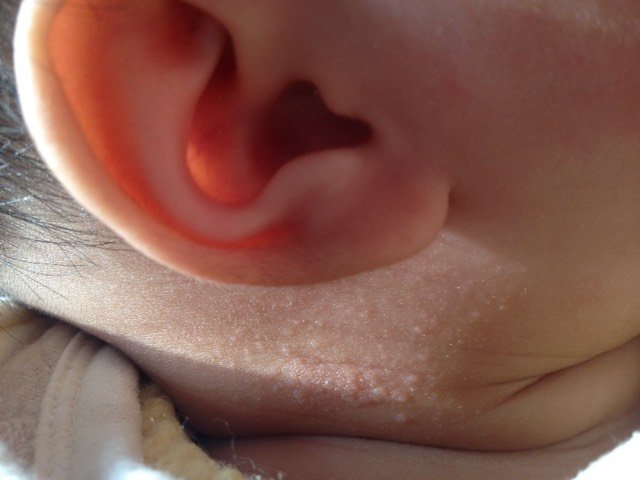 宝宝三个月右侧脖子里长出一粒粒小疙瘩不红,之前宝宝长过湿疹不过看起来和这次的不一样,想知道这是什么
