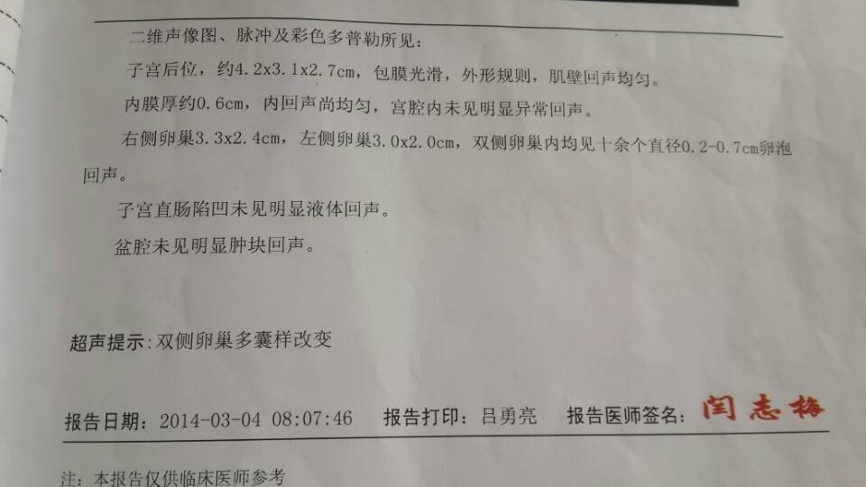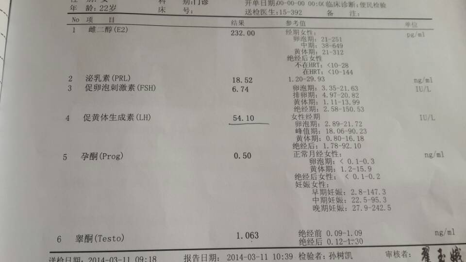2013年12月15日来的月经,后来2个月一直没来,2014年,2月10日去检查,没有怀孕 3月3 日又去检查,也是没怀孕,3月4日查了B超,提示双侧卵巢多囊性改变(如图)。医生让自然来月经检查性激素六项。3月8日9日10日,这3天都来了一点,颜色发暗,非常粘稠,有略微腹痛,3月11日也还有了一点,早晨9点空腹查了性激素六项(如图),医生说促黄体生成素(LH)略高,我问医生是不是多囊,医生说不能完全确定,然后就开了达英35,让今天开始吃,吃3个月。为什么会LH高?这个药有什么副作用吗?我平时有什么忌口吗,或者多吃什么比较好。谢谢了。我不多毛,BIM22.3,头发很少,隔夜就油。 点击展开 匿名用户 2014-03-11 13:40 为您推荐: 其他回答 病情分析: 你好,你的彩超显示多囊卵巢和激素LH升高提示就是多囊卵巢综合症 指导意见: 所以确实应该给予达英三五治疗,治疗时间至少半年以上。 匿名用户 2014-03-11 14:34 相关问题 我在2013年11月27日来的月经2013年12月12日发生了第一次性关系,后来怀孕了,那预产期几 我用早早孕测试纸测得是两条线,我是怀孕了吧?月经从2014年3月6日结尾的,到现在怀了多少天了? 6月9号月经,7月10号发烧,输了2天液,打了2针退烧针,后来才晓得怀孕,体温最高39 5,一般是