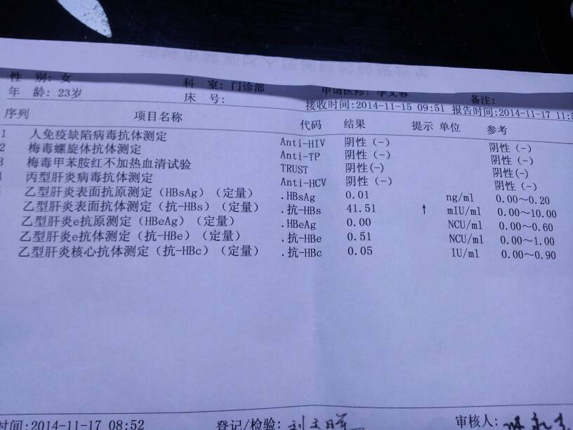 做了血常规那些还没让医生看结果,哪位懂帮忙看一下,谢谢啦 做了血常规那些还没让医生看结果,哪位懂帮忙看一下,谢谢啦 点击展开 Z、大钱 2014-11-25 18:03 为您推荐: 其他回答 是的,有抗体是好事 小城女子5whl 2014-11-25 23:36 没什么,挺好的 土豆sly 2014-11-25 21:27 从提供的报告看,艾滋病、梅毒、丙肝都是阴性,说明未被感染;另外,乙肝两对半中表面抗体是阳性,说明身体已有免疫力,是正常的。 wzlzx520 2014-11-25 21:19 很正常,, 小宝美女的妈妈 2014-11-25 20:25 有抗体呢。没什么事 小惠惠的亲娘呀 2014-11-25 19:07 加载更多 相关问题 宝宝的血常规单子,有懂的人给看一下是怎么回事么? 请问医生,明天做产检的时候做血常规需要空腹? 人流后一周回医院复查 医生说我还流血吗 我说没了她就说没有不舒服就不用做b超了 做个血常规就好了