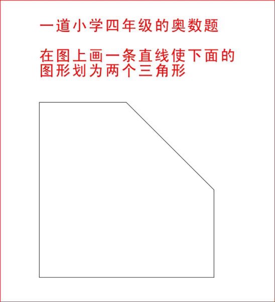 5分钟之内做不出来,就回幼儿园深造吧 点击展开 匿名用户 2014-01-22 18:31 为您推荐: 其他回答 从图的右上角往左下角画一个特别粗的线、一定要特别粗。、把右上角的斜线盖住、一定要很粗。就能分成两个三角形了。。这是一道脑筋急转弯似的题。网上就是这样给的答案 匿名用户 2014-01-22 18:34 相关问题 一道幼儿园入学试题,做不出的回幼儿园深造 一道疑似深圳某幼儿园的入学题,未料该题倒了一大片网友 孕期在幼儿园上班,幼儿园的厕所刷了墙漆,每天大概就闻十五分钟左右,期间我会出来透透气,对胎儿影响大 幼儿园导入语给几个吧,差不多3分钟时间