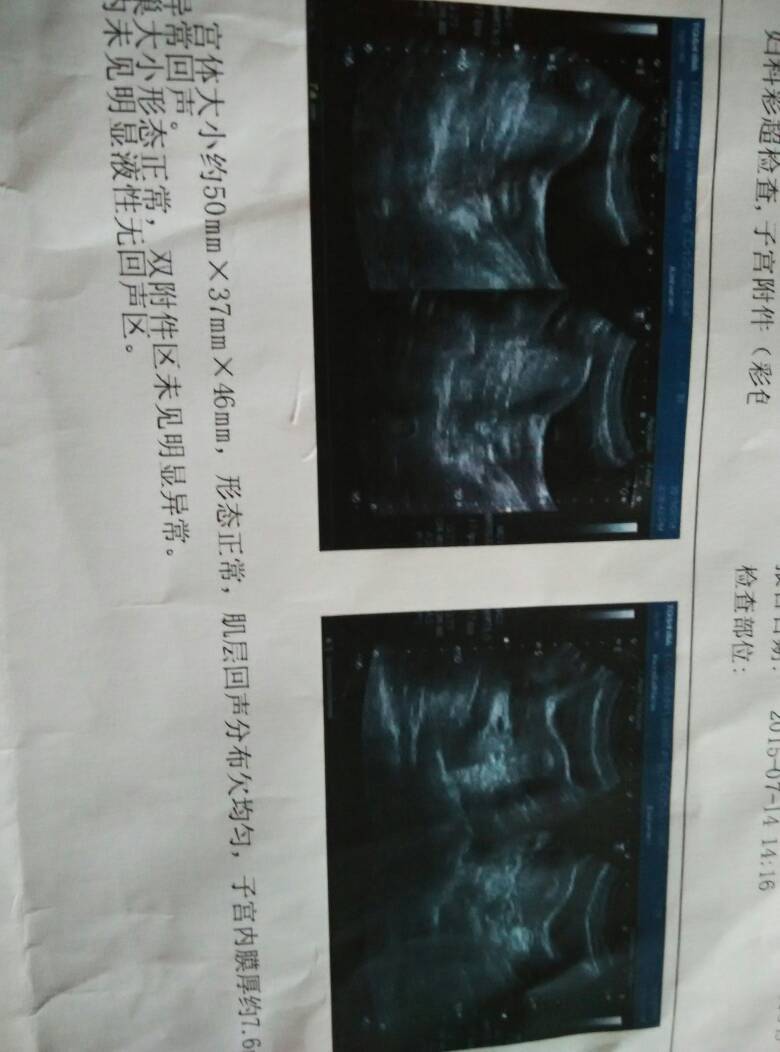 子宫前位,大小50*37*46,肌层回声分布欠均匀,子宫内膜厚7.6mm,居中,子宫直肠窝内未见明 子宫前位,大小50*37*46,肌层回声分布欠均匀,子宫内膜厚7.6mm,居中,子宫直肠窝内未见明显液性无回声区。 打算怀孕,彩超是月经来前三四天做的,不懂那个不均匀和子宫内膜厚度,请教! 点击展开 匿名用户 2015-07-14 16:38 推荐回答 ‘’回声欠均匀‘’月电虏经来潮前期;在月经厉锈前几天子宫内膜厚度在半厉队8-12mm是正常的。 东郭灵慧_eGp2 2015-07-14 16:50 宝宝知道提示您:回答为网友贡献,仅供参考。 相关问题 子宫直肠窝游离液性暗区深16mm 子宫右外侧见30*29mm的无回声区 子宫有卵巢囊肿盆腔少量积液 可能宫外孕 子宫前位,子宫体大小约4 5*4 6*3 8CM,肌壁回声均匀,内膜厚约1 2CM,子宫直肠窝可见约3 7*1 6CM液性暗区 子宫大小为52*41,形态规则 肌层回声均匀内膜居中 厚约8mm 子宫直肠窝未见明显异