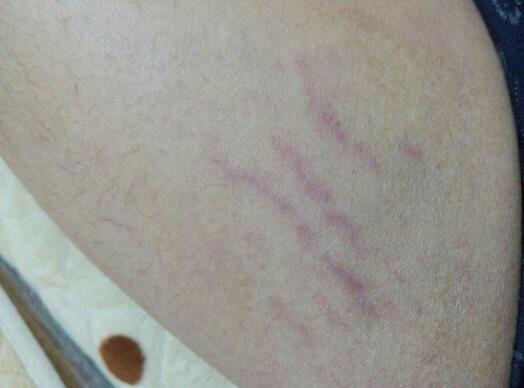 大腿内侧出现红色条纹,像女性怀孕时期的妊娠纹,别的地方没有就大腿内侧和左腿大腿上有,本人男,最近几