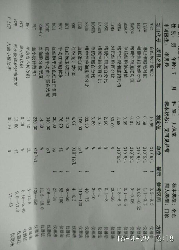 7+18天宝宝白细胞计数偏高,报告是在儿保科开单检查的,当时医生只说轻度贫血,其它什么都没说,症状 7+18天宝宝白细胞计数偏高,报告是在儿保科开单检查的,当时医生只说轻度贫血,其它什么都没说,症状:咳嗽有痰,呼吸时有莎莎音,晚上睡觉不安稳,时有哭闹,持续三天,在家吃药可以吗? 点击展开 lexiuju 2016-04-30 00:36 为您推荐: 其他回答 可以吧,, 宝宝爱粑粑麻麻:-D 2016-04-30 23:58 njjbhji 宝宝,就是我们的动力 2016-04-30 22:16 bjjbjhh 宝宝,就是我们的动力 2016-04-30 22:16 好的,治疗以后观察效果。 2016-04-30 22:01 hjhihh 宝宝,就是我们的动力 2016-04-30 21:56 加载更多 相关问题 今天去给女儿做儿保医生检查出宝宝乳房有小块凝发育了可宝宝才1岁啊上网查了如果单纯乳房长大以后可能会 宝宝中度贫血,儿保医生给开了多维铁口服溶液,可宝宝不吃,每次吃都要哭好久,该怎么办呢? 请问四个月的宝宝会贫血吗?儿保医生说宝宝贫血让补铁