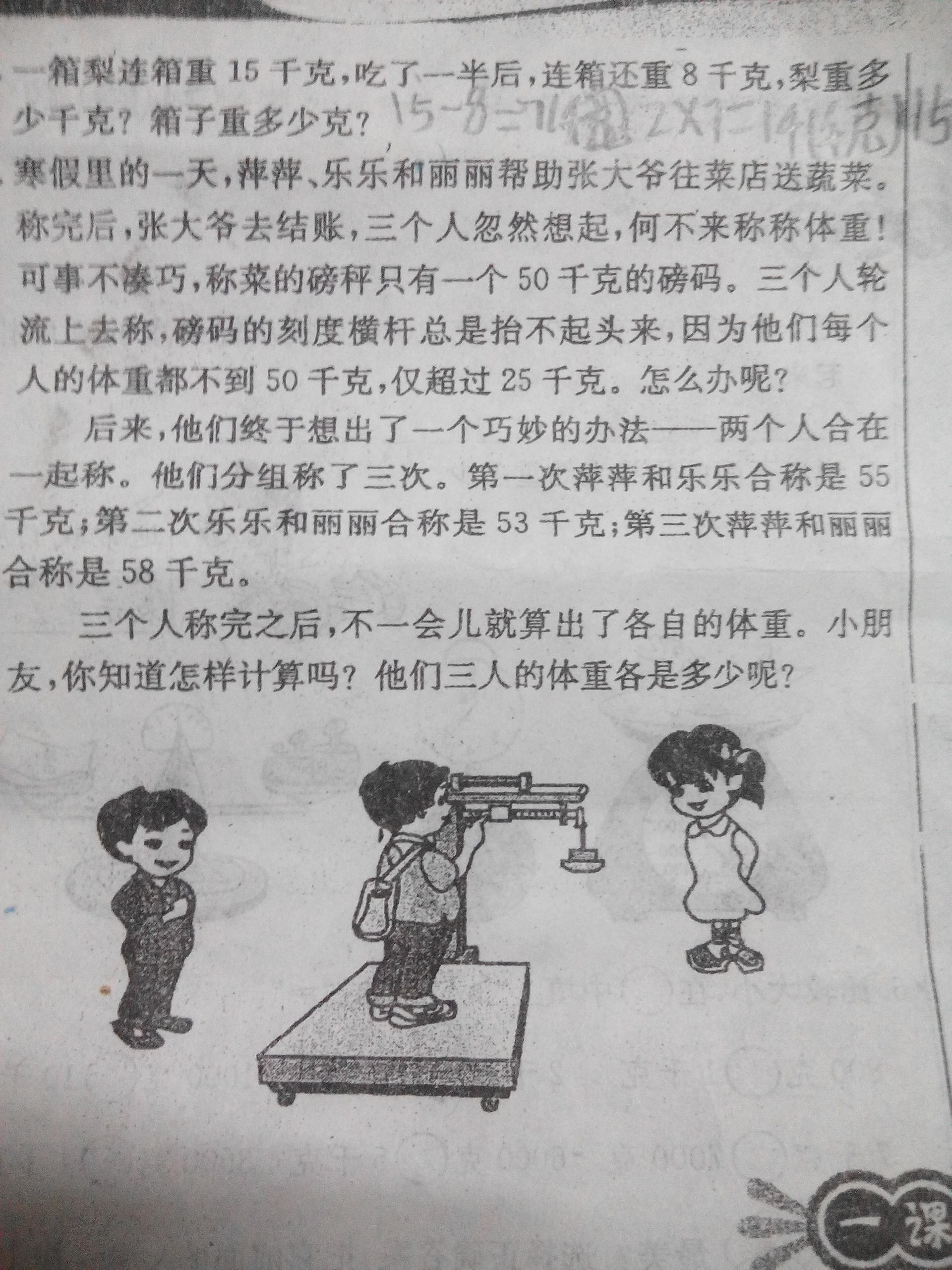 亲们有谁知道这个作业怎么写吗(孩子的作业)?帮个忙,先谢谢各位了 点击展开 夏侯问兰_wAv9 2015-06-21 18:27 满意回答 萍萍:x 乐乐:y 丽丽:z x+y=55 y+z=53 x+z=58 求解出来:x=30 y=25 z=28 匿名用户 2015-06-21 18:39 宝宝知道提示您:回答为网友贡献,仅供参考。 相关问题 请大家来帮个忙,作业孩子的,第八题的1,2,3题咱个做,求,急 请亲们帮个忙吧!能不能帮我找一份工作,我一边照顾孩子一边上班 说说上看到的 有点好奇这是啥软件,so来请各位亲帮个忙啦~