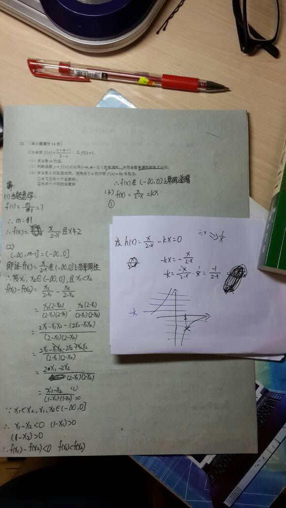 第三问,定寸瓦义域中x可以为0,故你的左右同时除以x是不对的 正确做法应该是左右同乘2-x。整理一下是kx^2-(2k-1)x=0 这个新函数是一个二次函数,当它全在x轴一侧时,无解, 与x轴相切是有一个解富渐,与x轴相交时有两个解,这化做揭个你就会算了