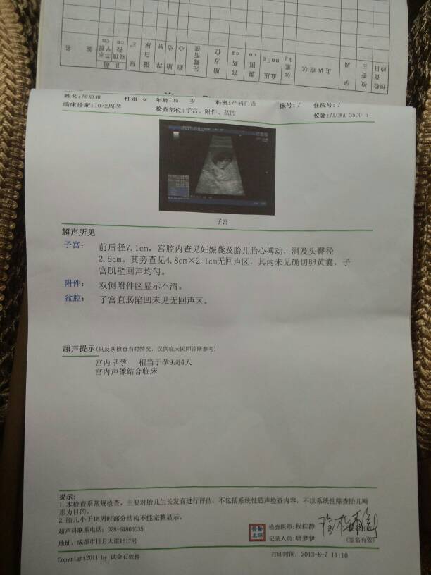 子宫,前后劲7.1厘米,宫腔内查见妊辰囊及胎儿胎心博动,测及头臂劲2.8厘米 其旁查见2.8*2.1厘米无回声 子宫,前后劲7.1厘米,宫腔内查见妊辰囊及胎儿胎心博动,测及头臂劲2.8厘米。其旁查见2.8*2.1厘米无回声区,其内未见确切卵黄囊,子宫肌壁回声均匀。附近,双侧附近显示不清。盆腔,子宫直肠陷凹未见无回声区 10周的b超,帮忙看看,谢谢了 点击展开 匿名用户 2013-08-08 10:54 为您推荐: 其他回答 您好,从声像图看考虑有先兆流产的可能,建议积极保胎治疗一周后复查彩超看看吧! wangqingcai22 2013-08-08 11:00 相关问题 子宫前位,增大如孕40-天,宫腔内可见3*2cm似妊辰囊回声,囊内未见胚芽及心搏 子宫大小增大,宫腔内可探及3 5*2 4cm的妊辰囊回声,其内可见胎芽,未见明显胎心 超声描述:子宫体积增大宫腔内可见妊娠囊回声,大小约2 7*2 0CM,囊内可见胎芽和尽管博动 应该是多少天?