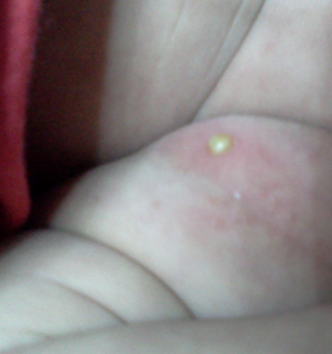 应该到医院就诊,防止局部感染导致全身的感染,因为孩子的皮肤嫩,抵抗力差。