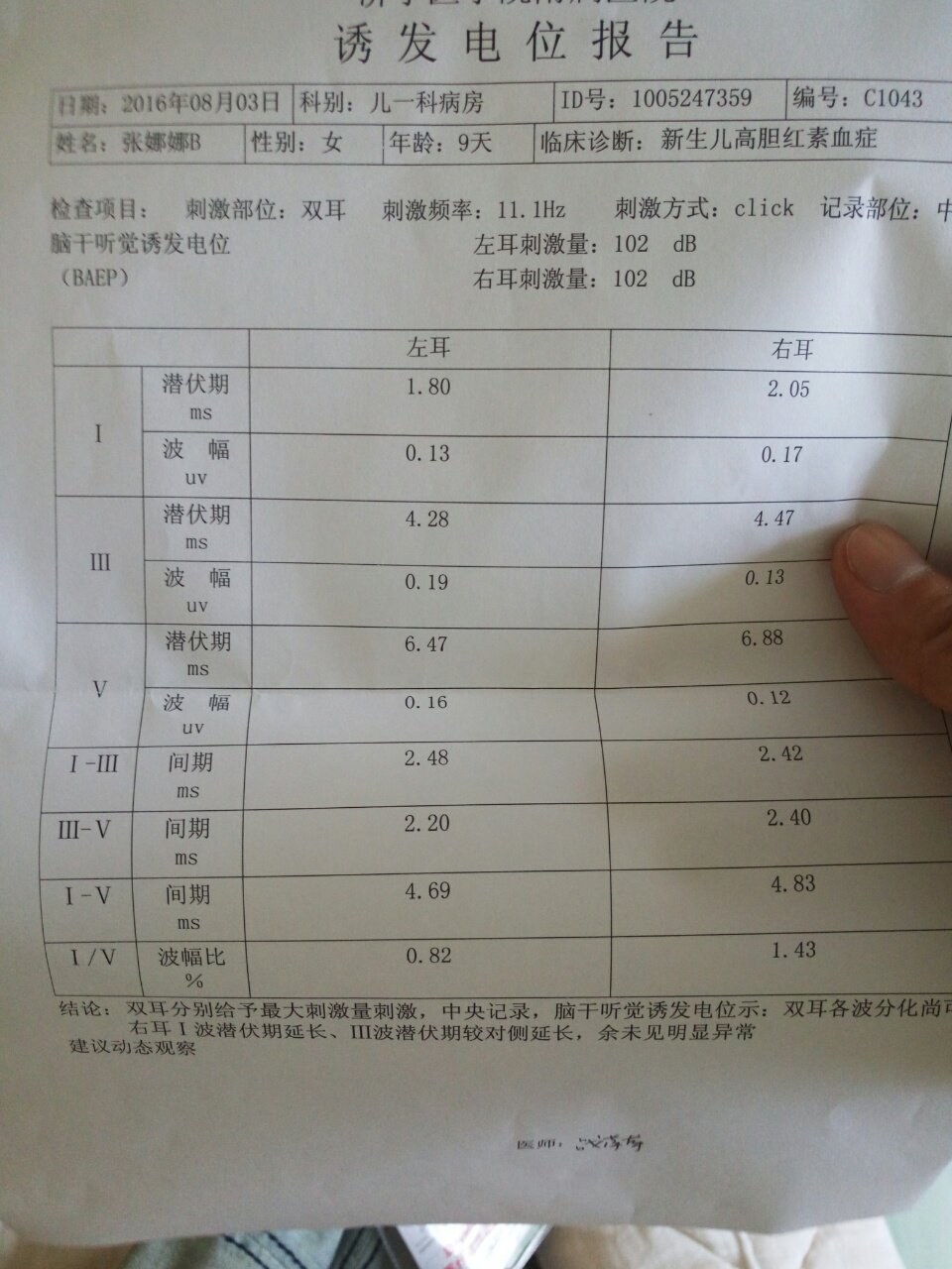 12天宝宝诱发电位检查右耳1-3波潜伏期延长 12天宝宝诱发电位检查右耳1-3波潜伏期延长 点击展开 李夏沫723 2016-08-03 17:58 为您推荐: 其他回答 不知道。。。 跟他们 2016-08-04 13:58 不懂,,,, 幸福颖儿 2016-08-04 09:58 ........ 156*****215_5jUD 2016-08-03 23:20 祝宝宝健康! 155*****938_SQIW 2016-08-03 21:42 路过。。。。 186*****870_gxzR 2016-08-03 20:41 加载更多 相关问题 两岁小孩听力检测右耳波潜伏期延长 宝宝一周岁做脑干诱发电位报告v波反应阀左耳70db右耳是80db请问这是怎么回事 我家宝宝3个月时检查听力时 双耳波v反应阈都是50dBnHL,9个月复查左耳为70dBnHL 右耳为60dBnHL怎么办?