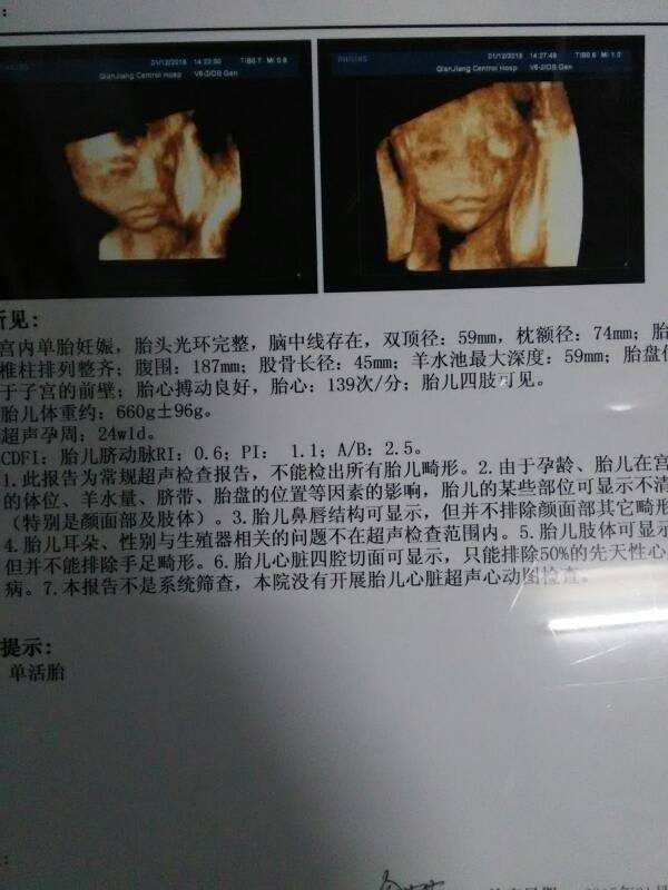 今天去做四维彩超啦,第一次看到宝宝的样子啦,小脸,尖下巴,感觉一点都不像我,就是不知道是男宝宝还是