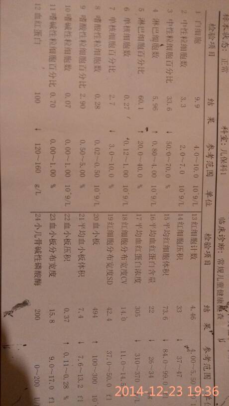 你好,欺虏这张血常规检查报告显示:白细胞总数正常,中性粒细胞百分贸斯比下降,淋巴惠府宰细胞百分比升高,且比率变化明显,提示有病毒感染,具体要根据患儿的病情分析。中性粒细胞和淋巴细胞都是白细胞,根据这两种细胞类型的比率变化,可以反应是细菌感染(中性粒细胞升高,淋巴细胞下降),还是病毒感染。