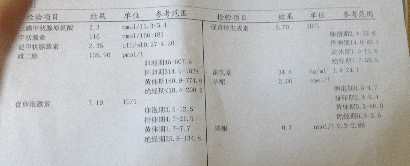 请问雌二醇139.90促卵泡成熟激素7.10黄体生成激素5.70催乳素34.6孕铜2.00睾铜0.7有没有什么问题,谢谢 一直在备孕中,快一年了,老公检查精子活力也正常,我的检查也说正常但是为什么一直没有怀上,比较着急了,感谢医生帮我看看,感恩 点击展开 母婴用户346250822 2015-01-02 16:20 为您推荐: 其他回答 你好,你的情况建议进行双方检查为好,女方检查排卵情况及子宫内膜情况,男方检查精液情况。 河北神医喜来乐 2015-01-03 16:24 相关问题 不来月经,性激素六项结果,促黄体生成素13 50促卵泡激素5 84雌二醇137 30孕酮2 43睾 请问雌二醇46 23促卵泡成熟激素7 10黄体生成激素20 09催乳素25 22孕铜0 493睾铜0 341有没有什么问题 月经第三天查的性激素,请帮忙看下 促黄体生成素 1 18 促卵泡激素 4 12 雌二醇