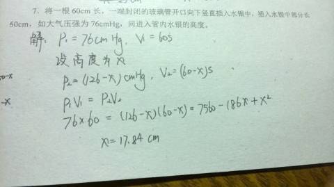 初态 P1=P0=76cmHg v1=60s 末态厘立 p2=p0+50-x=126-x cmHg v2=(60-x)s p1v1=p2v2 x^2-186x+3000=0x=17.84cm 答案是正确的俗恨,没航兵悟问题