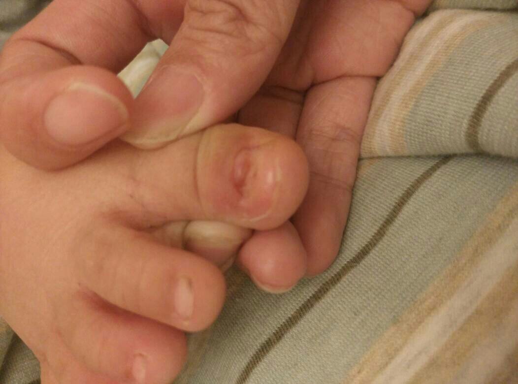 宝宝脚趾甲被砸,去医院拍片子没有伤到骨头,半个月后被砸指甲已经脱落,照片里的甲床下面突出小肉是新长