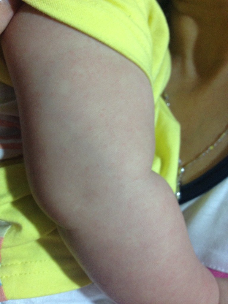 我家阿宝六个月,昨天下午发烧,一直是38度,到今天下午为止,已经退烧,但是手上、身上长了一些红疹子 我家阿宝六个月,昨天下午发烧,一直是38度,到今天下午为止,已经退烧,但是手上、身上长了一些红疹子,宝妈们帮我看看,是不是幼儿急疹啊? 点击展开 ╃傻Y頭oО 2014-09-10 20:19 为您推荐: 其他回答 应该是幼儿急疹 不要给宝宝吹风啊! 爱,的味道 2014-09-10 20:29 有可能是幼儿急诊,也可能是对什么东西过敏导致的,还是需要去医院检查的, liuwenda1989 2014-09-10 20:19 相关问题 5个月的宝宝高烧到38度吃药退烧后身上和脖颈处长了许多红疹子,请问怎么回事? 请问八个半月的宝宝发烧38度左右嗓子有点发红,查血说白细胞低 只烧24小时就退烧了,身上又起疹子了请问出疹子期间可以吃甘露聚糖肽口服溶液,利巴韦林气雾剂吗谢谢各位老师,急 你好,宝宝9个月大,嗓子发炎一段时间,然后发烧三天,退烧后出了一身疹子,然后做心肌酶谱,医生说有心肌