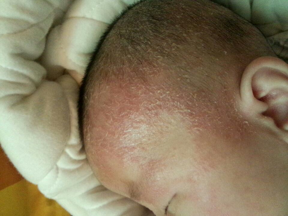 麻烦各位宝妈或医生帮我看看宝宝的头部是怎么了,擦了茶油不觉得有好些,早上起来额头更严重了