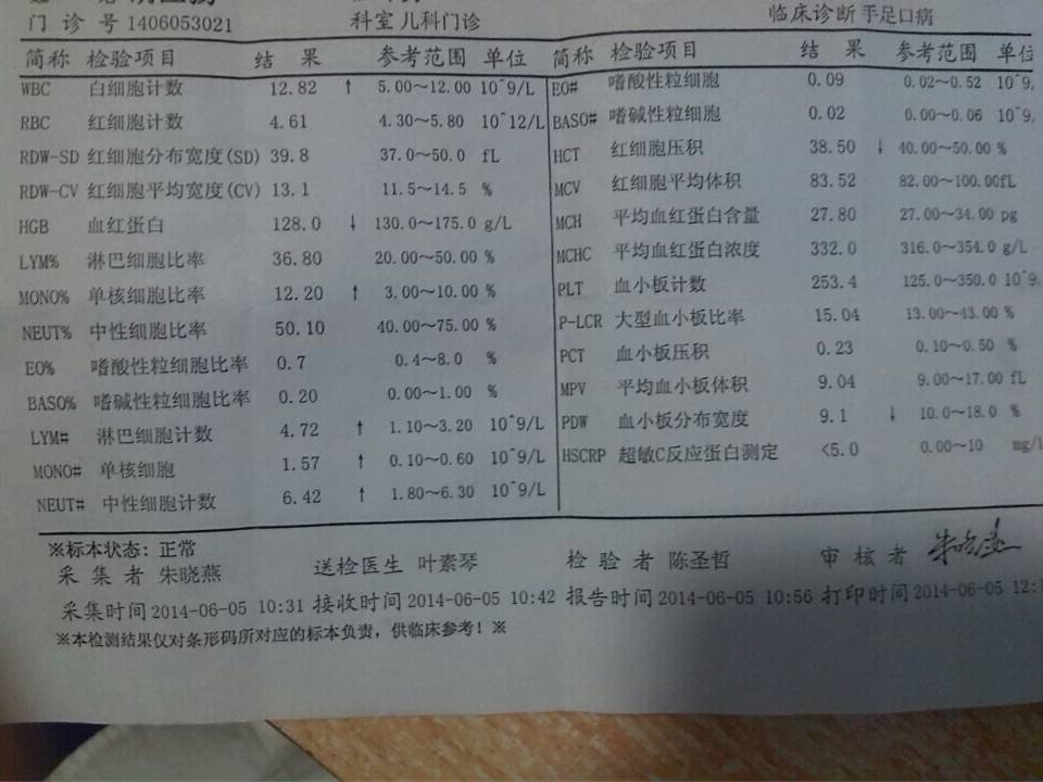 6月5号宝宝说嘴疼,手上有小水泡,到医院看医生说是轻微的手足口病,开了药,下午化验单拿去另一个医生 看的说要住院,因为宝宝一直没发过烧我们就没住院.回家吃药观察了两天昨天去复查身上的疱疹都消了医生又开了药,现在小孩有点咳,听声音有痰,会不会是严重了呢? 点击展开 匿名用户 2014-06-09 09:05 为您推荐: 其他回答 您好,孩子轻微的手足口问题是不大的,加重的可能性是不大的。 左昕昕_1Bka 2014-06-09 13:06 相关问题 我女儿手上嘴里起了水泡 我怕是手足口病 但是她不发热 也不哭 还很能吃饭 找了大夫大夫说是什么口疮 三岁宝贝体温37 5度,脚上和手上有小量水泡,下嘴唇有一个溃疡,可能是手足口病么 孕15周了,最近脚气又复发了,起了好多水泡,我想问一下医生擦药会对宝宝有影响么?