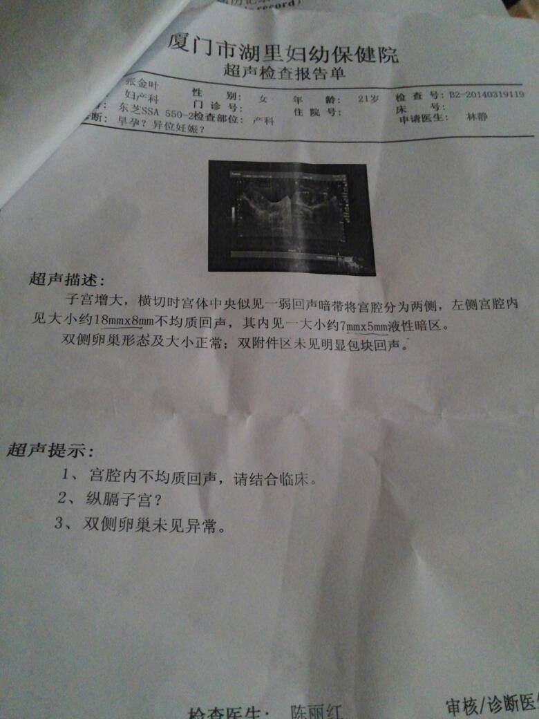 您好!我末次月经是1月27,月经周期正常标准 怀孕51天的时候检查出来是纵隔子宫,B超医生说没有看 您好!我末次月经是1月27,月经周期正常标准。怀孕51天的时候检查出来是纵隔子宫,B超医生说没有看见孕囊,这会是什么情况?然后B超是什么意思呢?图片已上传,请帮忙看下,hcg8596孕酮值19.65.这是头一胎能保住吗?我21岁,谢谢医生了?液性暗区代表什么呢?左侧大的那个是什么? 点击展开 匿名用户 2014-03-23 12:25 为您推荐: 其他回答 病情分析: 你好,根据你的描述,你的情况有可能怀孕了, 指导意见: 现在怀孕时间短,所以可能还看不到孕囊,建议过几天再到医院检测检测吧。 匿名用户 2014-03-23 12:27 相关问题 医生您好~我最后一次月经是阳历2013年12月6号(月经周期是45天至60天),5月4号B超显示 请问医生,不完全子宫纵隔对怀孕有影响吗,影响大吗? 有没有纵隔子宫的妈妈,我怀孕了,但是医生说我是纵隔子宫,好担心