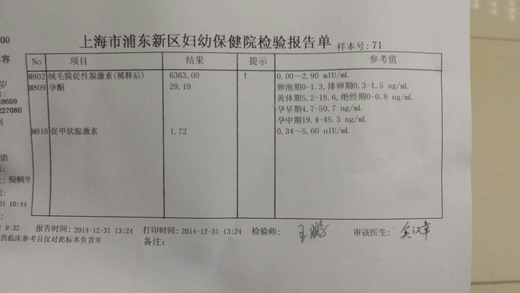 11月22末次,12月31日验血结果孕酮29.19,绒毛膜促性腺激素6363 正常吗?见图 11月22末次,12月31日验血结果孕酮29.19,绒毛膜促性腺激素6363。正常吗?见图。 点击展开 白精蟾蜍 2015-01-03 10:17 为您推荐: 其他回答 祝宝妈好运 琳子💄 2015-01-03 19:54 祝宝妈好孕 136*****781_1PQE 2015-01-03 13:04 正常!!! 鑫茹妈妈 2015-01-03 11:42 祝你好运, 馨瑶妈妈 2015-01-03 11:13 你好,现在的检查值还是可以的,建议要动态检查激素水平,或者B超检查,综合分析胚胎的发育情况。 cn#BBVkpkakGL 2015-01-03 10:59 加载更多 相关问题 5月11日末次月经,现在孕期9周(64天),今天验血孕酮值为15 2ng/ml,绒毛膜促性腺激素值为53956mIU/ml 偏低吗? 11月22末次,12月31日验血结果孕酮29 19,绒毛膜促性腺激素6363 正常吗?见图 我孕酮测定结果为22 6 人绒毛膜促性腺激素结果1835 99 验血2次 医生说确定怀孕了今天出血