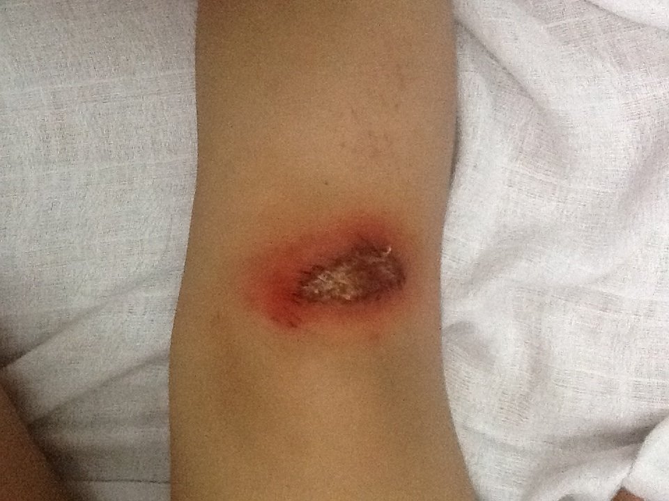前天小孩晚上路上跑玩腿关节下方磕破皮没出血诊所处理擦了红药水也没有沾水昨晚小孩玩皮床上乱蹦又碰到伤