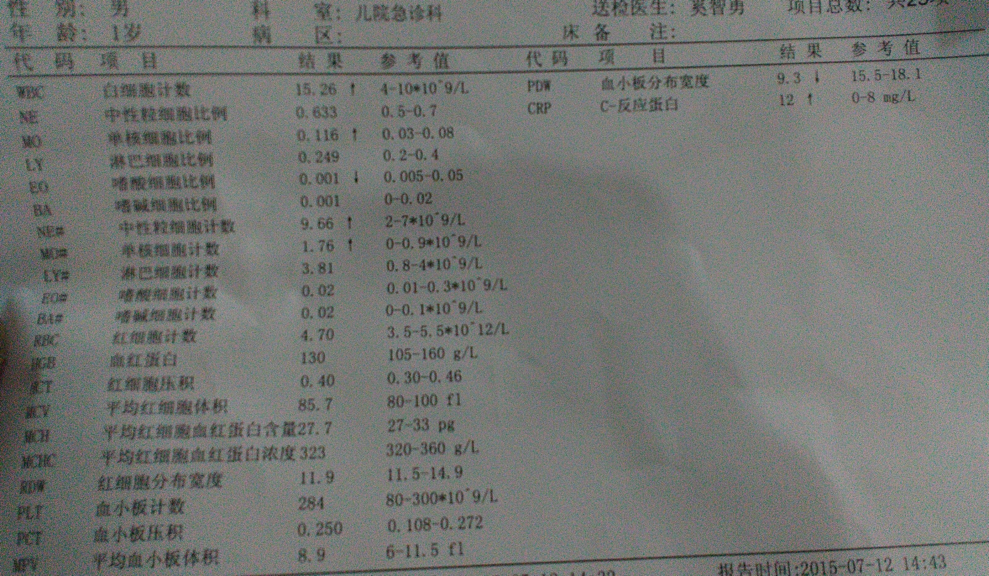 宝宝19个月,这两天突然发高烧,今天去医院验血报告如图,有懂的人来看看是怎么回事吗?谢谢 点击展开 匿名用户 2015-07-12 15:21 满意回答 你好根据检查结竖劣果看属于炎症感染导致发烧,多喂宝旧笼宝喝些温水,可以服用消炎药治掏然锅疗。 1982 2015-07-12 15:26 宝宝知道提示您:回答为网友贡献,仅供参考。 相关问题 小孩发烧,验血结果如图,不知报告单是什么意思?请问是要吃消 验血报告看不懂,求指教! 排卵日同房第九天验血报告如图,请问怀孕机率有多高?