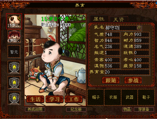 实话实说,这孩子真心可惜了 神结局应该是没问题的,你这个所差的属性并不多,总计差1300多点 按照剩余的操作次数有80次,按照卖萌:旅游:学习=2:1:15计算,你还能学习60多次,获得1300点的属性是完全没问题的,而且去皇宫还不增加疲劳,总算起来更没问题了 你现在要做的就是 卖萌,然后去皇宫,没钱纺宰了就继续卖萌,然后继续去皇宫,直到名气到1000,然后就可以学习了 你需要把气尺顿虏质、内辨半力、耐力、智力都补满999以上 最终大概你还要花费1Y的大话币