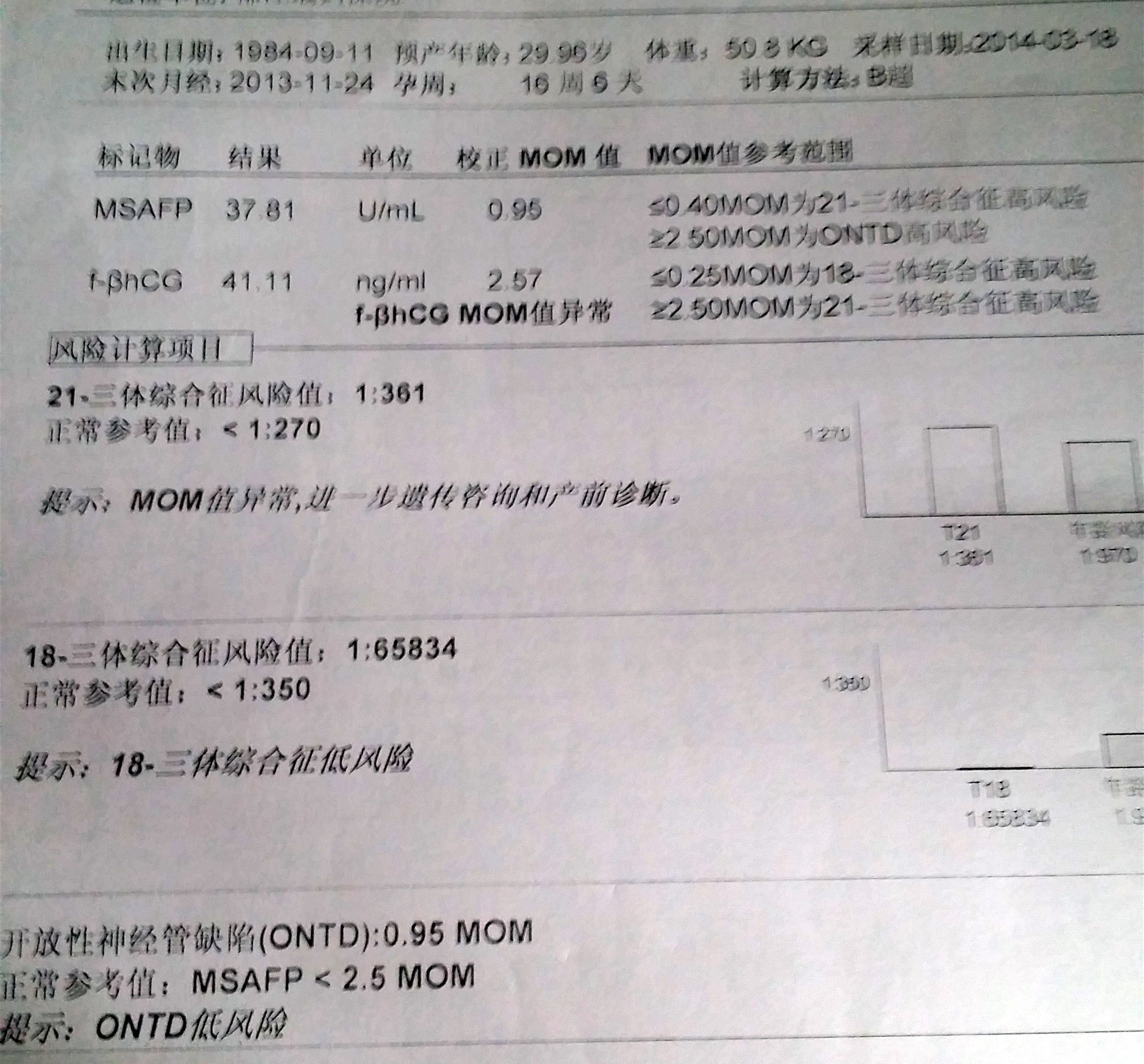 16周6天唐氏筛查hcg为2.57,正常值不超过2.5,正常吗 具体如图,请问风险大吗?可以不做羊水穿刺吗? 点击展开 匿名用户 2014-03-28 20:11 为您推荐: 其他回答 病情分析: 你好,你唐氏筛查结果任何一项不过关都是属于高风险 指导意见: 所以你还是属于高风险,HCG不正常,这个还是应该做羊水穿刺进一步确诊,筛查只是可能性,不是确诊。 匿名用户 2014-03-28 20:29 相关问题 我怀孕16周时做的唐氏筛查说是HCG值2 23 正常值是不高于2 0 请问有问题吗? 月经推迟8天了,孕期不超过三周 HCG3034正常吗? 停经38天,hcg1094 怀孕几周了?为什么还看不见孕囊?hcg正常吗?