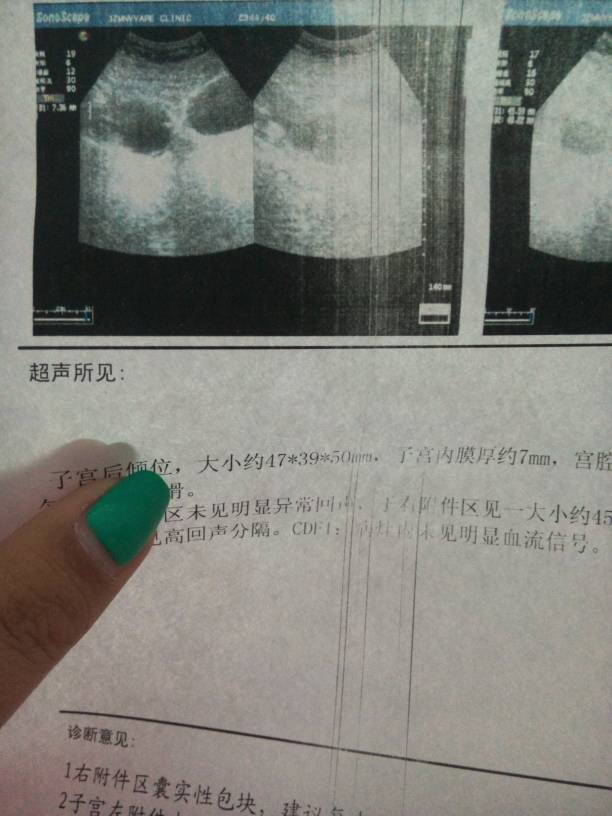 B超检查 子宫后倾位,大小约47*39*50mm,子宫内膜约7mm,宫腔线居中,实质回声均匀,表面