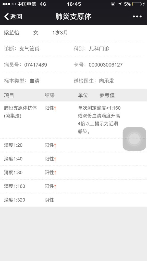 有谁能帮我看看,我女儿咳嗽一个多月了医生叫我做了个支原体抗体,今天出了报告但是挂的下个星期的号,严 有谁能帮我看看,我女儿咳嗽一个多月了医生叫我做了个支原体抗体,今天出了报告但是挂的下个星期的号,严重吗 点击展开 执子念, 2016-09-08 20:25 为您推荐: 其他回答 不太清楚哦 159*****012_v2Se 2016-09-09 23:13 没事。。。 g'h'j'k 2016-09-09 10:05 多喝水比较好 小糯米丸子 2016-09-09 00:28 应该没事吧 幽笑 2016-09-08 22:51 给宝宝阿奇霉素抗感染试试疗效。 cn#BpLLfGfpLf 2016-09-08 21:56 加载更多 相关问题 我女儿每天早上咳嗽,白天没事,己经一两个月了吃了药无效检查了,是肺炎支原体抗体阳性己经2个月了,最 你好!有医生在吗?我家小孩咳嗽是反反复复的咳,早晚就咳的厉害,也查血常规和支原体都没事这到底是怎么 三岁的女儿上次支原体支气管炎好了一个多月又咳嗽,老也不好,有没有给宝宝提高免疫力的好办法呢