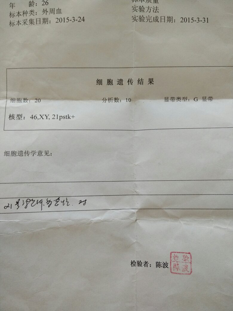 谁能看明白这个化验单是什么意思 这个是染色体的,检查不孕的时候做的 点击展开 匿名用户 2015-08-01 16:21 满意回答 染色否恨体一共23对,每对染禁局色体都有它的正常形态,你的结果显示第21对染色体形态和正常人不一样,显示多形态,你这种情况助朗稼应该到大医院遗传科看一下,更专业 zhouhouyun1 2015-08-01 19:43 宝宝知道提示您:回答为网友贡献,仅供参考。 相关问题 请问下染色体检查是什么 有没有人做过呢 孕妇30周,透明隔腔9mm,医生建议做染色体检查,有沒影响,要不要做 请问哪些染色体疾病与不孕有关?