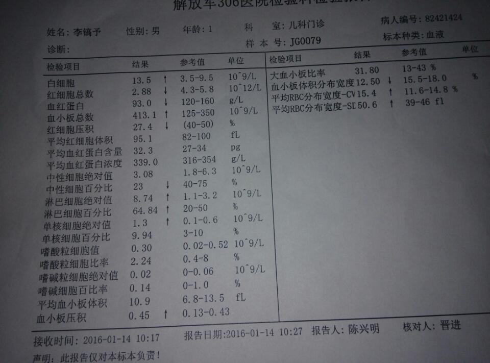 41天宝宝血常规单子,最近老鼻塞 还未打卡介苗 41天宝宝血常规单子,最近老鼻塞。还未打卡介苗 点击展开 137*****004_kaDc 2016-01-15 15:59 为您推荐: 其他回答 没事,,, 文栋 2016-01-15 21:31 可以多喂点水 小昕妈妈 2016-01-15 20:10 有病毒。血小板高。多喝水 槿轩妈咪 2016-01-15 18:11 问问医生吧 年大娘 2016-01-15 17:08 多喝水。。。。 漫雪叮馨 2016-01-15 16:47 加载更多 相关问题 出生41天的宝宝血常规结果是这样,请问是要怎么办?最近宝宝老鼻塞 宝宝吃完奶咳嗽,下半夜鼻塞,有清鼻涕,请问怎么样了,我把血常规放上来 孕5周的时候感冒,只是打喷嚏,喉咙干,鼻塞,去医院做了个血常规检查,结果正常,那对胎儿会不会有影响?