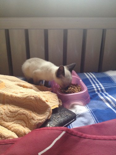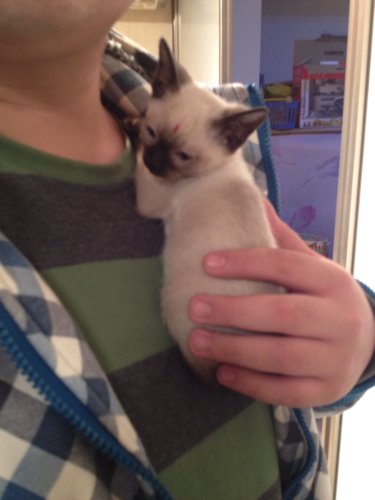 我昨晚拿回来的暹罗猫宝宝,母猫2个月左右吧,昨天刚拿回来的时候他就藏起来了,还不停的喵喵叫,到今天还在叫,还不敢出来,它躲在角落的时候我准备上去抱他出来,他就发出“哈”的声音,显然是不要我去碰它,我知道大概是应几天就会好,但是它一直在叫啊,我怕他会不会得了什么病!还有今早发现它流了好多眼屎,逗留到鼻孔了。请各位养暹罗的前辈们给指点一下。