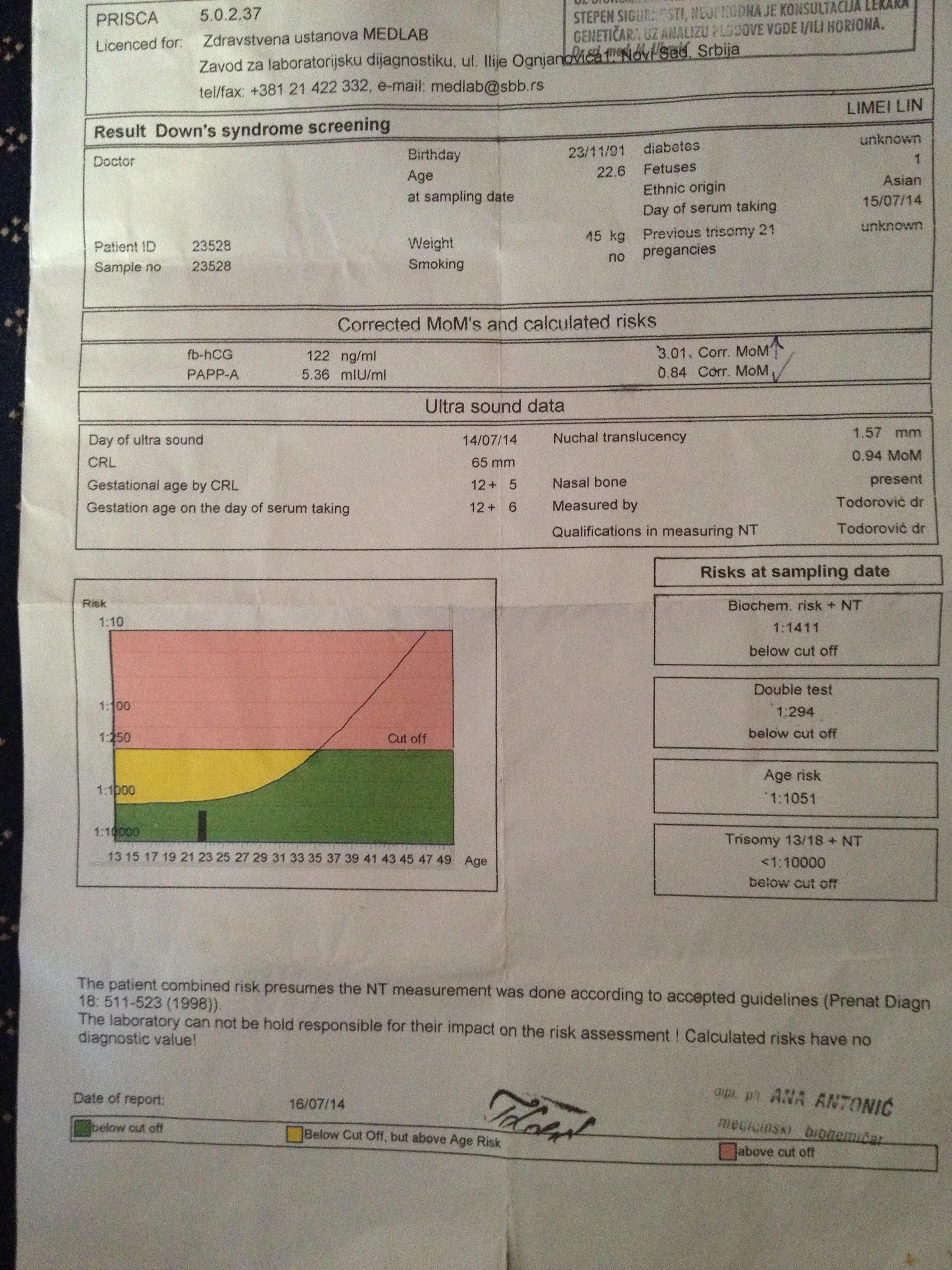 你应该拿到产科门诊去看 在哪里开的单在哪里看 然后医生会通过你的年龄,体重,静脉血中AFP以及β-HCG的水平,结合你其他的一些情况(如是否吸烟或酗酒等),计算出你的胎儿分别患有以上三种先天性疾病的风险值。依据风险值的高低你将得到一个阳性(高危)或阴性(低危)的结果。光拿报告单意义不大。你应该是第一...