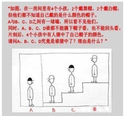 一道幼儿园入学试题,做不出的回幼儿园深造 一道疑似深圳某幼儿园的入学题,未料该题倒了一大片网友 点击展开 匿名用户 2013-07-28 11:11 满意回答 必须是D小朋友啊。因们敲为题中说到A看不到BCD,所以不可能是A,究劣朗但是D却可以看到ABC的帽子。耗急 匿名用户 2013-07-28 11:20 宝宝知道提示您:回答为网友贡献,仅供参考。 相关问题 深圳盐田有哪些幼儿园? 离深圳市宝安区西乡镇固戍航城大道南昌上合工业园A栋最近的幼儿园时哪家? 深圳龙岗区南联小学离龙城街道的爱联幼儿园有多远