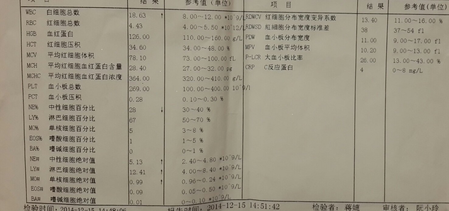 一岁宝宝白细胞高,无发烧,挂水第八天一直没有好转 宝宝1周岁,刚开始是腹泻,去了医院,验血结果白细胞高,18左右(正常是8-12),说要挂水,我没同意,开了一些头孢,过了几天,开始咳嗽,流涕,鼻塞,又去医院,白细胞还是很高,医生说呼吸道又有炎症了,无奈,只能挂水,一个疗程3天结束,验血还是白细胞高,又挂了3天,验血下来19点几,又去拍了片子,不是肺炎,说支气管炎。医生换药,开了更高规格的头孢,并加了计量和化痰的药,现在挂了2天,还是没什么明显好转,今天挂完水回来,宝宝开始吃什么吐什么,我家宝宝到底病症是什么?是细菌性的还是病毒性的?如果是病毒性的,那么抗生素的无效的,现在吃东西都开始吐了,再这么挂水下去也不是办法啊 点击展开 匿名用户 2014-12-16 23:18 为您推荐: 其他回答 正常人的血象应该4000-10000.你的宝宝第一次验血,白细胞高达20000,说明有严重感染。 非一般170 2014-12-17 10:10 相关问题 宝宝发烧,输液后白细胞低,怎么办啊,现在不发烧了,还需要继续输液吗 我家宝宝出生第八天了,手心有点热,是不是要感冒发烧呀?其他都比较正常 宝宝10个月了,拉肚子,还吐,还发烧,现在退烧了,就是吃完奶就吐,拉的是稀水便,有点奶瓣,白细胞是