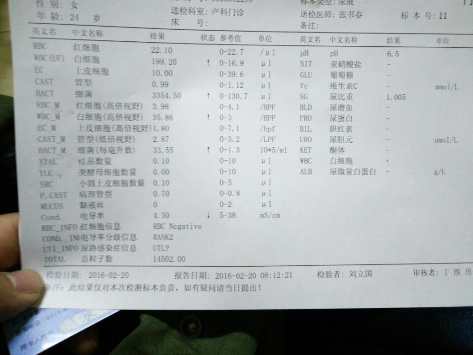 我老婆现在怀孕35周+4天,今天大夫让做尿检,可是白细胞和细菌结果全部高于正常值请各位帮忙看一下 我老婆现在怀孕35周+4天,今天大夫让做尿检,可是白细胞和细菌结果全部高于正常值。请各位帮忙看一下,谢谢! 点击展开 呃呃😖 2016-02-20 08:39 为您推荐: 其他回答 那么医生说要紧吗?你老婆孕期跟我一样 淼淼心肝 2016-02-20 21:34 拿给医生看看,会给你正确的解决办法的 放飞的景色 2016-02-20 20:54 可能是炎症 乖乖小甜心 2016-02-20 18:41 问问医生吧 阳光的花花小妞 2016-02-20 15:40 用开水熏蒸。 看守所的犯人 2016-02-20 15:37 加载更多 相关问题 孕37周尿检白细胞和细菌值超标什么情况 尿检结果细菌数量和白细胞数量好高啊,怎么回事?难道是尿路感染? 尿检白细胞,培养细菌无