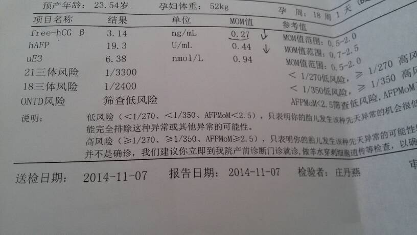 宝媽们,free-hcg值和hafp值偏低有没有什么大问题 宝媽们,free-hcg值和hafp值偏低有没有什么大问题 点击展开 小糖果- 2014-11-18 14:26 为您推荐: 其他回答 你好,这两个数值低的话问题不会很大的,你注意到了怀孕6个月的时候做个四维,如果没有问题可以不需要担心了 一直在路上yw 2014-11-18 17:34 相关问题 FREE-HCG值为0 81 hafp值为0 90 NTD风险 筛查阴性 21三体风险 1/5700 18三体风险 1/43900 有风险吗,谢谢! 唐氏筛查Free-hCG,hAFP,uE3三项都高很多怎么办?