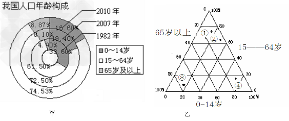 一家英国媒体撰文呼吁中国全面放宽计划生育政策以应对人口问题。我国人口专家翟振武教授也表示,计划生育政策调整的时候已经到了。结合下图 ,回答1~2题。 1.翟振武教授认为“计划生育政策调整的时候已经到了”的主要依据是 [ ] A.人口数量持续减少B.0~14岁人口比重不断上升C.15~64岁人口比重有所下降 D.65岁及以上人口比重不断上升 2.依据乙图信息,乙图中能够反映我国2010年人口年龄构成的是 [ ] A.①点B.②点C.③点D.④点