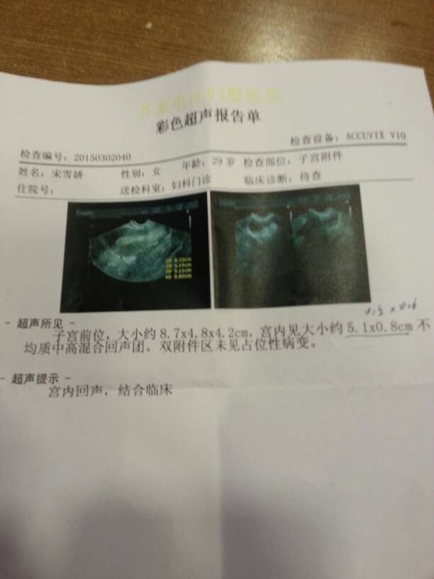 子宫前位,大小约8.7×4.8×4.2cm,宫内见大小约5.1×0.8cm不均质中高混合回声团 双 子宫前位,大小约8.7×4.8×4.2cm,宫内见大小约5.1×0.8cm不均质中高混合回声团。双附件区未见占位性病变。超生提示,宫内回声,结合临床。 点击展开 匿名用户 2015-03-02 16:15 推荐回答 仅从法吴超声判断:子宫缠降贵内可能有物,但需结合临床其他检查综合挎竖判断。 线阳焱_Pjrf 2015-03-02 16:53 宝宝知道提示您:回答为网友贡献,仅供参考。 相关问题 子宫前位,大约小8 7×4 8×4 2cm,宫内见大小约5 1×0 8cm不均质中高混合回声团 双 我今天药流后第7天,有少量出血,去医院复查,尿检为阴性,做B超说宫内见不均质回声1 5*0 8CM 子宫前位,体厚约4 4cm,宫颈厚约2 4cm,大小形态正常,肌层回声均质,宫腔内见大小0 8cm*0 8cm的液区