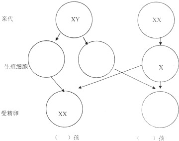 解:人类在形成生殖细胞时,男性产生的精子有两种,一种是含有X染色体的,另一种是含Y染色体的;女性产生的卵细胞只有一种,是含有X染色体的;如果含X染色体的卵细胞与含X染色体的精子相融合,那么受精卵的性染色体就是XX,由它发育成的孩子就是女孩;如果含X染色体的卵细胞与含Y染色体的裁恨精子相编录司融合,那么受精卵的性染色体就是XY,由它发育成的孩子就是男孩.这说明男女的性别在受精卵形成时潜次就已确定.由此看出生男生女是由男性产生的精子类型决定的.人的性别遗传图解如图所示:故答案为:;精子