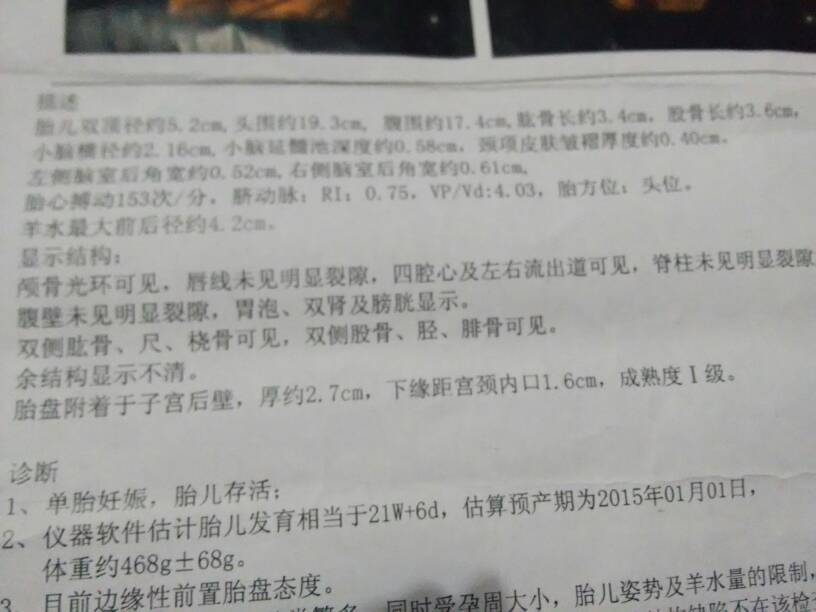 麻烦各位医生帮我看一下4维彩超的报告,因为本人去做彩超时医生下班了,做完彩超我拿了报告就直接回家了 麻烦各位医生帮我看一下4维彩超的报告,因为本人去做彩超时医生下班了,做完彩超我拿了报告就直接回家了,没有给医生看,也不知道宝宝有没有问题 点击展开 但愿奇迹的出现 2014-09-26 21:43 为您推荐: 其他回答 。。。。。。。 爱老公爱宝宝 2014-10-02 22:32 有空带着单子去问问,, 16674巴巴巴63 2014-09-29 13:44 有空时可以拿着单子去找医生问问的 ♛好宝贝 2014-09-27 07:18 第3项看后期会长多少!看得见的没问题 两撇胡子027 2014-09-26 22:55 做完医生没有说什么吧? 嘟嘟嬷嬷 2014-09-26 21:59 加载更多 相关问题 :做四维就照一下彩超吗?医生就给了我这样一张彩超报告,说看到的都好,就没有了是这样的吗 看的懂的宝 怀孕25周了,羊水最大深度7 6,医生说有可能是胎儿畸形,让半个月后去做4维彩超,很担心啊畸形可能 孕30周照彩超羊水指数204mm 还是偏多,怎么办?查了血糖都正常 医生们宝妈们看看我的报告单,给