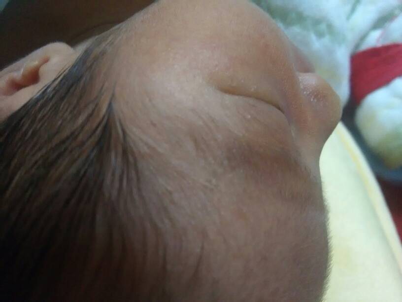 急,急,急,哪位医生帮忙看一下,宝宝刚出生五天,请问眉毛角黑黑的是不是胎记啊?另一边眉毛角也有