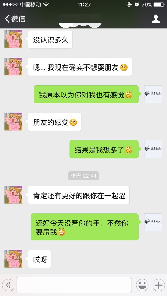 我和一个女孩在微兔峡指信上认识的,和她聊天的时候我们聊的很开心,我们都知道对方是单身,因为她在读书而我在外面上班,我们见面的时间不是很多,我们一共见了两次面,对她的感觉很不错,因为昨天是星期六嘛,我们昨天又指录出来见面了,本来昨天想跟她当面表白可是因为胆小,昨天没敢说,回家之后在微信说的喜欢她,想和她在一起,可是她拒绝行劳了,请各位帮我看看,我现在心里很复杂,我和她认识了20天左右 昨天晚上拒绝了,今天晚上我们又像平时一样聊天,听我一言