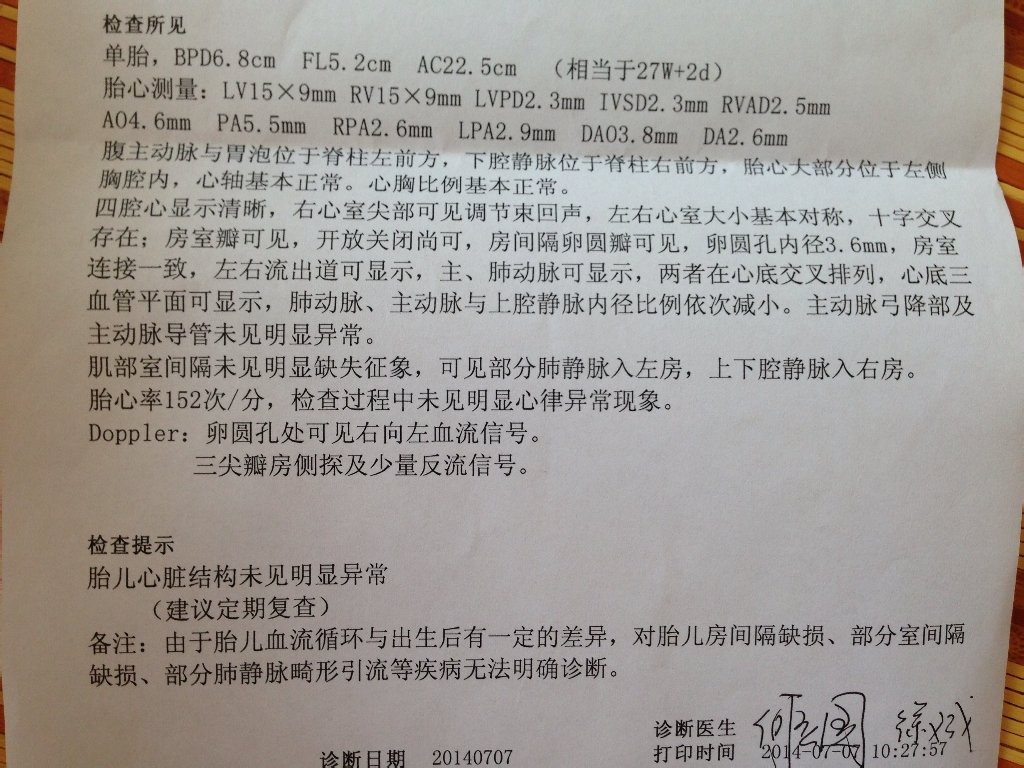 今天去做的胎儿心脏检查,检查结果不太理想,有谁能帮我看看,到底问题大不大! 今天去做的胎儿心脏检查,检查结果不太理想,有谁能帮我看看,到底问题大不大! 点击展开 萌大蒙 2014-07-07 15:15 为您推荐: 其他回答 看单子没事呀,怎摸了?医生说有事吗? 静静地…… 2014-07-07 15:24 相关问题 检查胎儿心脏 今天做四维,胎儿头偏大,怎么办?还有心脏左心室有一点强光,怎么办? 今天做了胎儿心脏彩超,说是胎儿心脏三尖瓣少量反流,左心室灶壮强回声,什么意思啊?担心!
