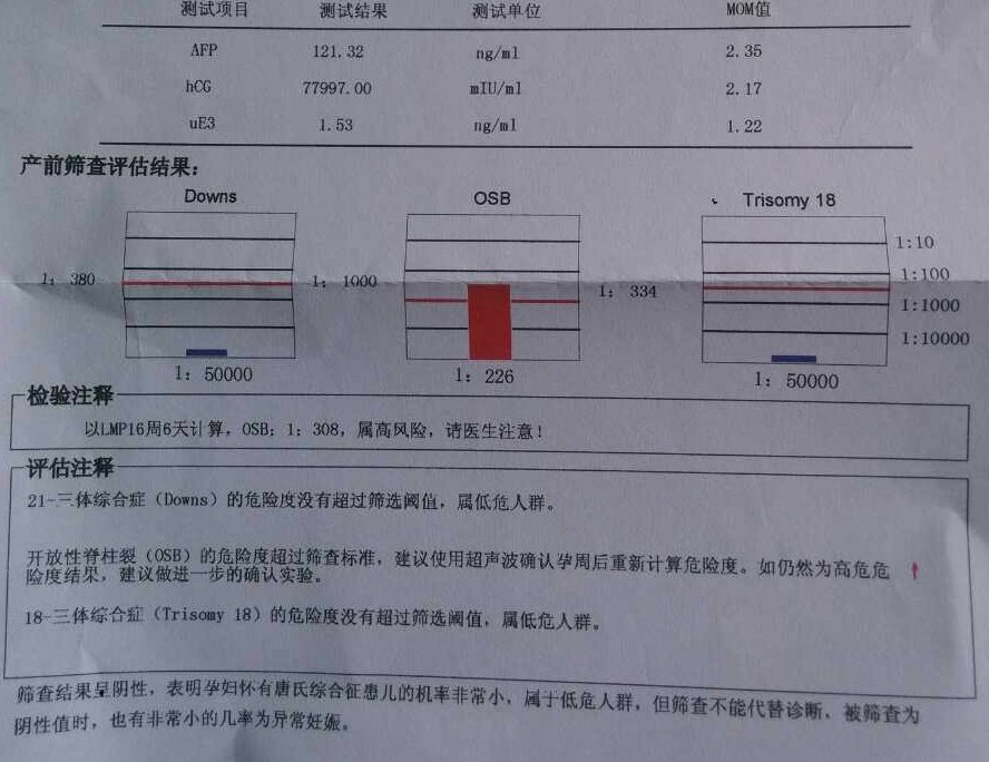 0sb高只能说明有开放性脊柱裂的可能性,别担心,心态很重要。做个四维彩超让医生看一下有没有脊柱增大的情况,一般是没事的。我爱人前段时间也被通知说osb高,检查后说是没事,虚惊一场。之前也有亲戚,1:100+的最后生下来小孩也非常健康。建议:1-2周后做个唐筛复查,定期做四维彩超,让医生仔细看看脊柱的...