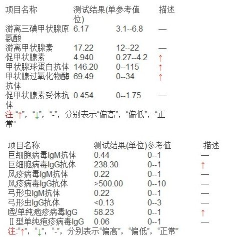 老婆怀孕39天,去医院医生让检查了:甲免6项 和TORCH 今天去医院 拿检验结果,妇产科的医 生 ,说甲免6项有点问题,让我们去内分泌科看看,内分泌科的医生 开了:优甲乐 让我老婆一天吃 半颗 过一个月 在检查 没有说其他的。 我和媳妇现在挺担心的,怕对宝宝有影响,我们刚刚结婚 第一个孩子 麻烦问下 这个检查结果代表了 什么 ,孩子还能要吗? 检查结果 看图 女 年龄25岁 身高160 体重60公斤。 点击展开 匿名用户 2013-12-09 20:34 相关问题 我老婆现在怀孕两个月了,前几天做B超检查发现盆腔里有个包块,医生建议抽血做肿瘤四项我们做了,结果出 我老婆月经延迟第六天的时候发高烧四十度去医院验尿为阳性,医生说怀孕了,不能乱吃药,然后医生开了清开 我老婆怀孕三个多月了 去做验血检查医生说我们两个阳性有点低 这样对宝宝有危险吗 严重吗!
