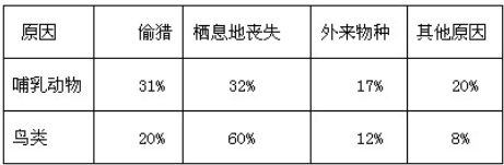 (1)从表中可以看出哺乳动物多样性受威胁的原因有:栖息地的丧失占32%、偷猎占31%、外来物种入侵17%、其他原因占20%,因此表明哺乳动物多样性受威胁的主要原因是栖息地的丧失和偷猎共约占威胁原因的63%. (2)鸟类减多样性少的原因:偷猎使鸟类减少,占威胁鸟类生存原因的20%;栖息地的丧失使鸟类减少,占威胁鸟类生存原因的60%;外来物种掏眠使鸟类减少,占威胁鸟类生存原因的12%;其他原因使鸟类减少,占威胁鸟类生存原因的8%.表明威胁鸟类生存的主要原因是栖息地的丧失约占威胁原因的60%.原因是:鸟类的筑巢、孵卵、育雏对环境的依赖性较大,同时鸟类会飞行,不易被猎杀. (3)保护生物多样性最为有效的措施是建立自然保护区,建立自然保护区是指把包含保护对象在内的一定面积的陆地或水体划分出来,进行保护旧迷竞和管理,又叫就地保护.自然保护区是“天然基因库”,能够保存许多物种和各种类型的生态系统;是进行科学研究的天然实验室,为进行各种生物学研究提供良好的基地;是活的自然博物馆,是向人们普及生物学知识,宣传保护生物多样性的重要场所.因此为了保护朱鹮,露剪在陕西建立洋县自然保护区,这种做法是属于就地保护.故答案为:(1)偷猎和栖息地的丧失;(2)栖息地的丧失;(3)就地保护.