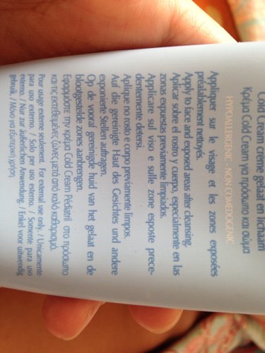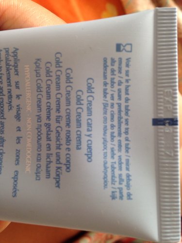 图一: 前面究柿件四行字 “参看冷霜顶部” 接下来六行字 “冷霜适用于脸部和身体各部位” 橙色那行字 “低过敏反应 --- 不堵塞毛孔产生黑刺” 图二: 前面大部分文字 “清洗后涂抹于脸部及身上露出的皮肤上耗瓦” 最后四行字 "仅供外用脑挤"