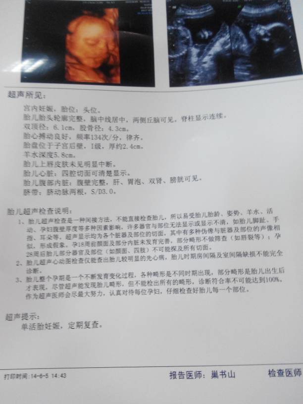 刚做的四维彩超,第一次看看宝宝!这单子看的出男女吗!没问题吧 刚做的四维彩超,第一次看看宝宝!这单子看的出男女吗!没问题吧 点击展开 拿青春当赌注~ 2014-06-05 15:13 为您推荐: 其他回答 检查的医生是可以看的出来 的。 hbwxsxl 2014-06-05 17:05 我们这不让进除非有关系 韦轩妈妈 2014-06-05 16:12 家属是不可以进的 韦轩妈妈 2014-06-05 16:10 看不懂,医生也是根据数据推算的,他们都瞎说 韦轩妈妈 2014-06-05 16:09 看到他也不会告诉你,你自己又看不懂,真的想知道话,在网上查查清宫图,很准的 韦轩妈妈 2014-06-05 15:38 加载更多 相关问题 请帮我看看四维彩超的单子 有经验的宝妈帮我看看照的四维彩超是否可以看出分辨男女!胎儿超声测值:双顶径68m,头围253m 糖耐检查没问题,可是四维彩超医生说的好恐怖!说我羊水偏少,看不清肾发育好不好!围保医生说看打出来的单子上写双肾可见~除了羊水少其他内容也没啥不好!还是建议复查!