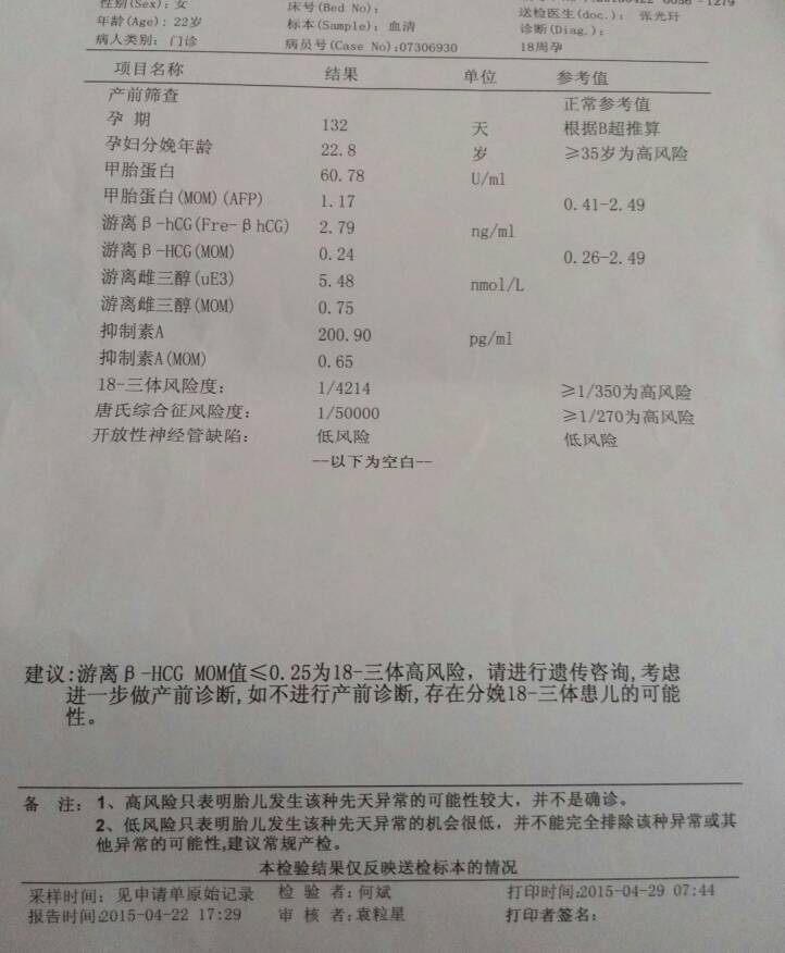 有没有医生能帮我看看,做了唐氏筛查,今天拿到结果,游离HCG(mom)=0.24; 18三体风险