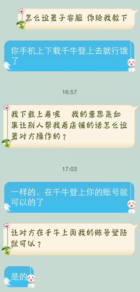 淘宝上设置子客服,让帮我盯着看店铺,我问我买店宝宝的那个人,他说是让对方下载个千牛软件,把我的号直